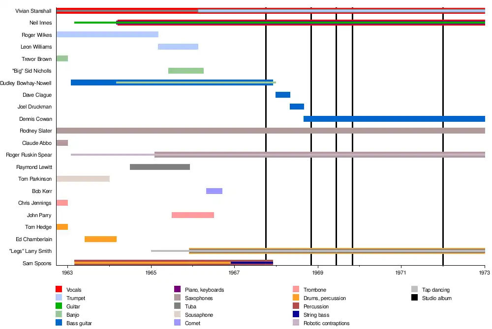 Band members continued to come and go throughout 1963 and 1964 but by 1965 the band had settled to a stable lineup of Stanshall (lead vocal/mime), Slater (clarinet/saxophone), Innes (piano/guitar/vocals), Bowhay-Nowell (basses/banjo), Spoons (drums/percussion), Spear (saxophone/devices), Nicholls (banjo), Williams (trumpet), Parry (trombone) and Raymond Lewitt (tuba). The line-up changed again later that year with the departure of Parry (who would later go on to be a founder member of The Pasadena Roof Orchestra), and the final 'classic' Bonzos band member, "Legs" Larry Smith, joined to replace the outgoing Lewitt. Smith was a long-standing friend of Stanshall's, the two having been students together at Central College of Art. Stanshall had long had designs on somehow insinuating his erstwhile drinking companion—Smith was a notorious bon viveur—into the band despite his lack of any apparent musical talent, with a view to exposing the world to Larry's undoubted charisma. While Smith's musical input at this point was, by his own admission, limited, he still brought a keen sense of showmanship to the Bonzos; strongly influenced by the movie The Rise and Fall of Legs Diamond, Larry adopted the name 'Legs' and took up tap-dancing, a skill he developed to such an entertaining level that it would later earn him a solo 'tap-dance extravaganza' spot in the band's stage show.