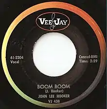 "Boom Boom" is a song written by American blues singer and guitarist John Lee Hooker and recorded October 26, 1961. Although it became a blues standard,[3] music critic Charles Shaar Murray calls it "the greatest pop song he ever wrote".[4] "Boom Boom" was both an American R&B and pop chart success in 1962 and a UK top-twenty hit in 1992.