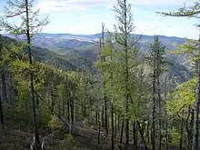 While the majority of studies on boreal forest transitions have been done in Canada, similar trends have been detected in the other countries. Summer warming has been shown to increase water stress and reduce tree growth in dry areas of the southern boreal forest in central Alaska and portions of far eastern Russia.[66] In Siberia, the taiga is converting from predominantly needle-shedding larch trees to evergreen conifers in response to a warming climate. This is likely to further accelerate warming, as the evergreen trees will absorb more of the sun's rays. Given the vast size of the area, such a change has the potential to affect areas well outside of the region.[67] In much of the boreal forest in Alaska, the growth of white spruce trees are stunted by unusually warm summers, while trees on some of the coldest fringes of the forest are experiencing faster growth than previously.[68] Lack of moisture in the warmer summers are also stressing the birch trees of central Alaska.[69]