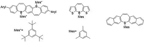 Borepins are a class of boron-containing heterocycles used in main group chemistry. They consist of a seven-membered unsaturated ring with a tricoordinate boron in it. Simple borepins are analogues of cycloheptatriene, which is a seven-membered ring containing three carbon-carbon double bonds, each of which contributes 2π electrons for a total of 6π electrons. Unlike other seven-membered systems such as silepins and phosphepins, boron has a vacant p-orbital that can interact with the π and π* orbitals of the cycloheptatriene.[1][2][3] This leads to an isoelectronic state akin to that of the tropylium cation, aromatizing the borepin while also allowing it to act as a Lewis acid.[3] The aromaticity of borepin is relatively weak compared to traditional aromatics such as benzene or even cycloheptatriene, which has led to the synthesis of many fused, π-conjugated borepin systems over the years.[2][3][4][5][6][7] Simple and complex borepins have been extensively studied more recently due to their high fluorescence and potential applications in technologies like organic light-emitting diodes (OLEDs) and photovoltaic cells.[3] [5][7][8][9]
