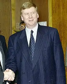 Over the course of 1994, Yeltsin became more and more separated from core reformist politicians and organizations.[1] At the same time, Yeltsin was also becoming more and more separated from the coalition government and its leader, Prime Minister Viktor Chernomyrdin.[1] Instead, Yeltsin increasingly relied on the advice of First Deputy Prime Minister Oleg Soskovets and his own bodyguard and confidant Alexander Korzhakov.[1] Soskovets had been shaping Yeltsin's campaign strategy.