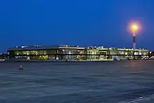 Terminal F is a passenger terminal mostly used by low-cost carriers and was opened on 21 September 2010 as a home base for Ukraine International Airlines.[26] Terminal F started handling regular flights as of 31 October 2010, with an initial capacity of 900 passengers/hour.[27] The terminal is not equipped with jetways as it was originally meant to serve low-cost airlines. However, the higher level of service offered led to the transfer of many scheduled European and Asian carriers to the terminal.