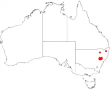 This boronia grows in forest on sandstone or granite and is found in the Gibraltar Range National Park and the Bylong-Sandy Hollow-Denman area.[2][3]