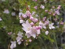 The flowers are pink to purplish and are arranged mostly in the upper leaf axils in groups of up to five on a stalk 3–10 mm (0.1–0.4 in) long. The four petals are 5–8 mm (0.2–0.3 in) long and glabrous. Flowering occurs from October to February.[2][3]