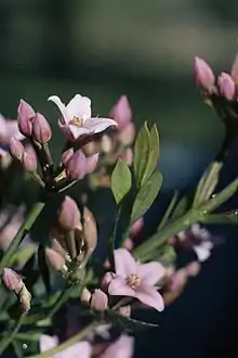 Boronia spathulata is a glabrous shrub that grows to a height of about 1 m (3 ft 3 in) and has well-spaced, narrow elliptic to broadly egg-shaped leaves that are 10–20 mm (0.39–0.79 in) long. Leaves near the ends of the branchlets are usually more or less cylindrical. The flowers are arranged in cymes that have a short peduncle, the individual flowers on a red pedicel that has small bracts at its base. The side flowers have a pedicel 3–4 mm (0.12–0.16 in) long. There are four triangular to egg-shaped sepals 2.5–4 mm (0.1–0.2 in) long and four pink, egg-shaped petals 6–9 mm (0.2–0.4 in) long. The eight stamens are hairy with a small white tip on the anther and the stigma is only slightly larger than the style. Flowers are present in most months.[2][3]