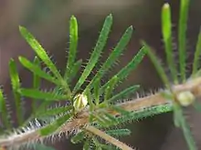 Boronia stricta is a slender shrub that grows to a height of 2 m (6 ft 7 in) with long soft hairs. The leaves are pinnate with between five and nine leaflets and 10–20 mm (0.39–0.79 in) long, the leaflets linear to almost cylindrical and up to 15 mm (0.59 in) long. A single or two or three pink flowers are borne in leaf axils, each flower on a hairy pedicel 2–5 mm (0.079–0.197 in) long. The four sepals are narrow triangular, 3–7 mm (0.12–0.28 in) long and hairy. The four petals are broadly elliptic, 5–9 mm (0.20–0.35 in) long and pink with a dark midline. The eight stamens are about 2 mm (0.079 in) long with the four stamens nearer the sepals swollen with a warty tip. The style is club-shaped. Flowering mainly occurs from September to December.[2][3]