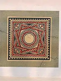 Botfield’s excavations revealed a large range of rooms which ran from north to south, part of which was a bath suite. It was deduced that the buildings were built over a period of time and that the northern rooms are later additions.[5] The earliest parts of the villa were built in the early years of the Roman occupation.[6] The villa consisted of a single storey and was constructed from the local marlstone (sandstone), infilled with rubble. The inside walls were plastered, as may have been the exterior, although this is not certain. The building had a tiled roof, examples of which can be seen in Northampton Museum. Some specimens of frescoed plaster were found still clinging to the remains of interior walls. It was also discovered that the villa had an elaborate heating system installed under the building. Hot air from a furnace or hypocaust flowed through the building by means of flues. Some of the floors were supported upon brick or flat stone piers which supported the floor leaving a two to three foot gap in which the air flowed. Botfield also discovered a well south-west of the villa. The well was stone lined and in the upper levels of the well a skeleton was found, with bronze accoutrements as well as an iron fibula and hook.