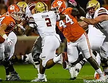 O'Brien was replaced by then Green Bay Packers offensive coordinator Jeff Jagodzinski.[63] In Jagodzinski's first year, the Eagles were picked to finish 2nd in the Atlantic in the ACC Preseason Poll. The Eagles raced out to a 7–0 start behind the arm of Matt Ryan and a stout, senior-laden defense. The Eagles climbed to No. 2 in the BCS Standings before squaring off against No. 8 Virginia Tech on a rainy night at Lane Stadium. The Eagles struggled on offense all night and trailed the Hokies 10–0 late in the 4th quarter. In a miraculous comeback, Ryan threw two touchdown passes in the final 2:11 of game to give BC the victory. Ryan's second touchdown pass, a 24-yard tear-drop pass to a wide open Andre Callender in the back of the end zone, caused ESPN's Chris Fowler to exclaim "Lane Stadium goes silent!" The come-back win vaulted Ryan into the Heisman discussion. BC clinched the ACC Atlantic Division with yet another dramatic win, this time over rival Clemson. Matt Ryan was once again the hero, finding a wide-open Rich Gunnell for a 43-yard TD pass with 1:46 to go to give the Eagles the 20–17 lead. Clemson's 54-yard FG attempt to tie the game fell short, clinching the victory for Boston College. The Eagles eventually lost the ACC Championship Game to the Hokies. BC played in the Champs Sports Bowl against the Michigan State Spartans, winning 24–21. 2007 marked the second time in Eagle history that the team won 11 games, the other being the undefeated 1940 season. Matt Ryan won the Manning Award and the Johnny Unitas Golden Arm Award, becoming BC's first major award recipient since Mike Ruth won the Outland Trophy in 1985. Ryan finished 7th in the Heisman race, garnering 9 first place votes. Jamie Silva was a Consensus All-American, BC's first since William Green in 2001.[64] The 2008 season saw the Eagles return to the ACC Championship Game, this time behind a defense that ranked 5th in Total Defense. The Eagles fell once again to the Hokies.[65] In both 2007 and 2008, the Eagles had defeated the Hokies in the regular season meeting only to lose in the ACC Championship Game. Following the 2008 season, Jagodzinski was fired for interviewing with the New York Jets.[66]