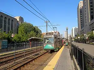 Boston University East station is a surface-level light rail station on the MBTA Green Line B branch located in Boston, Massachusetts. The station is located in the center median of Commonwealth Avenue, between Granby Street and the eastern end of Cummington Street, surrounded by the Boston University campus. It consists of two side platforms, which serve the B branch's two tracks.