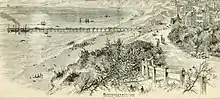 At a time when the most convenient way to arrive in the town was by sea, a pier was considered to be a necessity. Holdenhurst Parish Council was reluctant to find the money, and an attempt to raise funds privately in 1847 had only succeeded in financing a small 100-foot (30 m) jetty.[33] The Bournemouth Improvement Act of 1856 granted greater financial autonomy to the town and a pier was approved that year. A number of wooden structures were built before an 838 feet (255 m) cast iron design by Eugenius Birch was completed in 1880.[33][34] Under the Act, a board of 13 Commissioners was established to build and organise the expanding infrastructure of the town, such as paving, sewers, drainage, street lighting and street cleaning.[35]