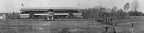 The Bowie Race Track was a horse racing track located just outside the city limits of Bowie, Maryland. The one mile oval racetrack, known as Prince George's Park, was opened October 1, 1914, under the auspices of the Southern Maryland Agricultural Society—in actuality the track's owners were famous Baltimore confidence men Gad Brian and Jim O'Hara.[2][3] A major attraction in the area, easy access for racetrack patrons was available from the WB&A Railroad which ran trains every five minutes from the Liberty Street Station in Baltimore for which they charged 65¢ for a round-trip ticket. Admission to the grounds and grandstand was $1.00.[4]