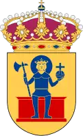 "Or, the town badge of Norrköping, sitting on a throne gules, a Saint Olof image dressed azure, crown or and halo, axe and orb azure."[3]