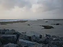 The earth embankment at Medmerry holding back the sea was originally built in the 1960s; however the coastline in the area was subject to frequent flooding events which were becoming unsustainable.[6] The scheme arose out of consultations from the 2008 Pagham to East Head Coastal Defence Strategy with the managed realignment scheme being adopted.[7] In 2013 the Environment Agency completed the new 7 km inland floodbank and breach in the shingle wall to providing flood relief and this enabled creation of the form the Medmerry RSPB nature reserve. The scheme cost £28 million. As of 2013 it is the largest open-coast scheme in Europe and is understood to be one of the most sustainable projects the Environment Agency has completed.[8] [9]