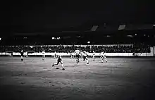 Valley Parade in Bradford, West Yorkshire, was built in 1886 and was initially the home ground of Manningham Rugby Football Club. Since 1903, when the club was formed, Bradford City Association Football Club had played their home games at the ground. The playing area and stands were very basic but the ground had enough room for 18,000 spectators.[1] When the association football club was formed, the ground was changed very little and had no covered accommodation. However, when Bradford City won promotion to the highest level of English football, Division One, in 1908, club officials sanctioned an upgrade programme. Football architect Archibald Leitch was commissioned to carry out the work.[2] By 1911, his work was completed.[3] It included a main stand which seated 5,300 fans, and had room for a further 7,000 standing spectators in the paddock in front.[2] The main stand was described as a "mammoth structure", but was unusual for its time because of its place on the side of a hill. The entrances to the stand were all at the rear and were higher than the rest of the ground.[4]