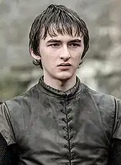Martin describes Bran as favoring his mother in appearance, having the thick auburn hair and deep blue eyes of the Tullys.[6] According to Martin, Bran is strong willed, but a sweet and thoughtful boy, well-loved by everyone at Winterfell. Before his fall he enjoyed climbing and exploring the walls and ramparts of the castle. He grew up wanting to be a knight for the kings guard, but those dreams were quickly brought to an end when Bran had to face the fact that he will never walk again.[7][8] He is also dutiful and tough-minded.