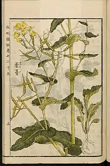 Oilseed subspecies (oleifera) of Brassica rapa may have been domesticated several times from the Mediterranean to India, starting as early as 2000 BC.[11] Edible turnips were possibly first cultivated in northern Europe, and were an important food in ancient Rome.[11] The turnip then spread east to China, and reached Japan by 700 AD.[11] There are descriptions of B. rapa vegetables in Indian and Chinese documents from around 1000 BC.[9]