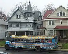 The Bread and Puppet bus on tour, parked in front of the Ant Hill Cooperative in Rochester, NY.