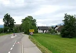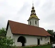 St. Radegund's Church, a Gothic structure, was first mentioned in 1468 as a church belonging to the Diocese of Radovljica, but is an older building with Romanesque foundations, partly reflected in the shape of nave and its flat ceiling. Most of the remaining structure is from the mid-17th century. There are two entrances to the church, one from the 14th century and a dated Renaissance portal from 1629. The bell tower with its typical onion-shaped roof is Baroque. There are frescoes of St. Radegund and St. Lawrence on the southern wall. St. Michael fighting a dragon is depicted on the northern wall and there is a baroque painting of St. Christopher on the southern exterior. There is evidence of a wall encircling the church, probably built in the 15th century to protect local inhabitants against Turkish raids in the area.[3] This was demolished in the 17th century, when the church was being rebuilt.