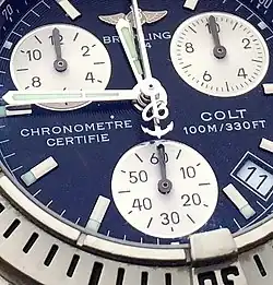 Breitling Colt is an entry-level luxury timepiece from Swiss watch company Breitling SA. The Colt has a stainless steel case with a set of four bezel rider tabs, which are a Breitling signature design detail first used on the Breitling Chronomat in 1984.[1] Breitling Colt models are powered by COSC-certified automatic movements or high-precision quartz calibers. Breitling ceased production of the Colt in 2020.[2]