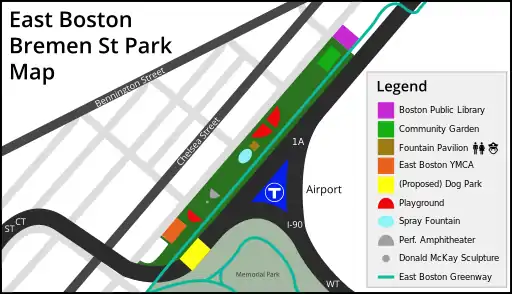 Bremen Street Park is an 18-acre[1] urban park, located in East Boston, Boston, Massachusetts. The park runs parallel to both Bremen Street and the Mass Pike/Route 1A and acts as a green space buffer between Logan International Airport and the residential neighborhoods of East Boston. The park is owned, operated and patrolled by the Massachusetts Port Authority (MassPort).[2] It is also part of the East Boston Greenway, a linear park and shared use path.