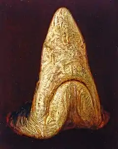 Zlamany first attracted notice for meticulously rendered paintings of animal carcasses (birds, blowfish, snakes, sharks, iguanas), isolated and floating ambiguously in dark, painterly abstract fields (e.g., Shark Head #2, 1992).[31][8][32] She began this work in the mid-1980s as a way to connect to visceral experience and elements of art practice—painting, craft, beauty—that she felt women were discouraged from pursuing.[28] Reviewers noted her mastery of academic glazing techniques, delicate sense of color and texture, and paint application suggestive of both Old Master and Abstract Expressionist technique;[27][4][9][41] in psychological terms, they described the paintings as "disquietingly seductive,"[42] vaguely allegorical, icon-like contemplations of life, death, desire and spirituality.[43][44][45][46] Janine Cirincione wrote that they "teeter on the edge of abstraction and representation, old master bravura and postmodern theory, between the seductive and the gruesome," with freewheeling art historical borrowings that challenged both traditional pictorial values and contemporary negations of representational work.[8] Barry Schwabsky likewise noted the work's conceptual preference for investigating materiality and illusionism and art's "half-feared, half-desired" fascination with representation and beauty over realism.[4][28] In a later series, Zlamany painted posed, live snakes that emphasized linear decoration, pattern and male sexuality while subverting traditional cultural associations of snakes with the feminine.[13][44][11]