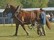 The Breton normally stands about 1.55 to 1.63 m (15.1 to 16.0 hands) at the withers, depending on type.[13] It is most commonly chestnut, flaxen chestnut or chestnut roan; bay and blue roan are less usual, and black is rare.[14]:154 Limited white markings are tolerated.[15]:7 The head is of medium size, the profile straight or convex; the neck is long and well set on, the shoulder long and sloped, the chest broad, the breast deep, the back broad, the croup broad and double, and the legs muscular.[15]:7