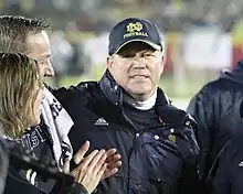 In December 2009, Kelly agreed to replace Charlie Weis as Notre Dame's head coach.[43] On December 10, Kelly announced that he had taken the position at Notre Dame.[44] He made the decision not to coach the Bearcats in the Sugar Bowl on January 1, 2010, which the Bearcats lost in a blowout to the University of Florida Gators.[45][46]