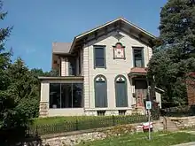 The historic district is made up of fourteen houses on the southern end of Bridge Avenue.[2] The street itself rises steeply to the north from River Drive. It is located along the east side of a ravine that separates it from the St. Katherine's Historic District on the west. To the north and west is the LeClaire Reserve, a largely residential area built on property that had belonged to city founder Antoine LeClaire. A residential neighborhood to the east that dates from the early 20th Century includes the Prospect Park Historic District. The houses along this section of Bridge Avenue were largely built from the 1870s to 1910.[3] The oldest house, however, was built in 1860. Ten of the houses are on the west side of the street and four are on the east side, which also includes the larger property of the Ambrose Fulton House. All but two of the houses are of frame construction. The two noncontributing elements in the district are a modern apartment building (730 Bridge) and a parking lot located at the foot of Bridge Avenue and Oneida Street.