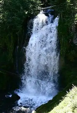 Bridge Creek Falls is a 25-foot (7.6 m) waterfall on Bridge Creek, in the Cascade Range west of Bend in the U.S. state of Oregon. Additional waterfalls are downstream along nearby Tumalo Creek, of which Bridge Creek is a tributary, including Tumalo Falls. All of these falls are within the Deschutes National Forest and is within the municipal watershed for the city of Bend.
