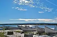 Brig Bay village is built on a very thin layer of soil that overlies deep-water gray limestones. The limestones formed from silt deposited nearly 500 million years ago at the coast of the Iapetus Ocean, the precursor of today's Atlantic Ocean.[16] Ordovician period gastropod fossils can be found in the limestones.[17] Evidence of the last ice age that ended less than 10,000 years ago is abundant in the glacial striations found in the bedrock and the erratic granite boulders lying on the limestones.[18] The raised beaches indicate that the land continues to rebound from the sea as a result of reducing pressure from the melted massive ice sheet that covered the land during the glacial period.[19]