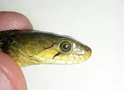 The brille (also called the ocular scale, eye cap or spectacle) is the layer of transparent, immovable disc-shaped skin or scale covering the eyes of some animals for protection, especially in animals without eyelids. In squamate reptiles both the nictitating membrane and the eyelids have been suggested as the evolutionary origin of the brille, but embryonic studies supports the fusion of the dorsal and ventral eyelids.[1] Brille means "spectacles" or "glasses" in German, Norwegian, and Danish.