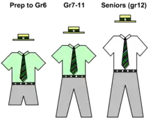 In Years 7–11, the only difference is that trousers are worn, and in Year 12 a white shirt is worn.[25]