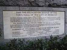 The first foundation stone was laid on Saturday 3 February 1917 by Queensland Governor (Major Sir Hamilton J. Goold-Adams) in advance of the building's construction. The stone was placed facing Albert Square (now King George Square). At the time there were no plans for the new building.[9] The stone was hollowed to allow a time capsule to be placed within it. The time capsule was a zinc cylinder; it contained:[10][11]