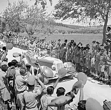 King George VI is driven past cheering Indian troops on his way to a ceremony to invest Sepoy Kamal Ram with the Victoria Cross, Italy, 26 July 1944. - Battle of Hong Kong