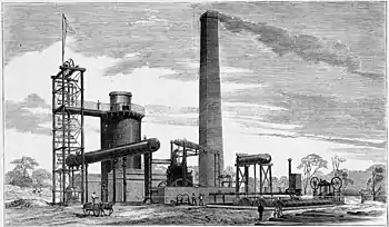 The blast furnace was designed and supplied by Andrew Barklay & Sons, Caledonian Foundry, Kilmarnock, Scotland.[9] It was hot-blast but an 'open-top' design, and so did not make use of furnace off-gases as fuel.[60] Its height was limited, to allow use of charcoal as a fuel,[61] although the furnace mainly used coke while in production.[62]