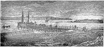 The company hired William Leonard as its manager during September 1872.[16] A settlement nearby to the mine was named Leonardsborough in his honour. Mining operations commenced at Mt Vulcan during 1872, and the new mine was one of the first to use dynamite.[17] By December 1872, a 310-foot long wharf had been constructed, 4¾ miles of timber-railed tramway had been laid, buildings erected at West Arm ('Port Lempriere') and Anderson's Creek ('Leonardsborough'), machinery was on order, 50,000 bricks were ready for the kiln, and construction had started on a smelting furnace.[16]