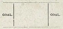 Two parallel lines are marked off from side to side straight across the center of the playground, leaving a narrow space between them of about ten feet in width, which represents the building ground for the wall.[95][93] On each end of the playground, a line is drawn across parallel to the building ground at a distance of fifteen to thirty feet, which marks the goal for the runners. One of the players is chosen to create the wall on the building ground, and takes his place upon it, facing all the other players who line up in one of the goals.[93] At an agreed signal (e. g. "Start!" or a similar call), the runners must cross the building ground to reach the opposite goal, the builder endeavoring to tag as many as possible during their rush without leaving the boundaries of the marked ground himself.[93] All the runners caught that way become a "stanchion" of the wall and assist the builder in trying to capture the rest of the players. After crossing the ground several times, the remaining runners must attempt to break through the increasing wall, which gradually becomes denser due to the growing number of catchers. Anyone refusing to break the wall is automatically considered caught.[95] The game ends when all of the runners have been caught, the last player taken being the "builder" for the next game.[93][96]