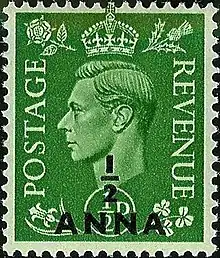 The first British stamps were nine current George VI definitives carrying surcharges ranging from one half anna to two rupees. Gibbons recorded twelve different issues of surcharged British stamps in Muscat, with varying numbers of values. These issues were mostly definitives but included some commemoratives such as the 1949 Universal Postal Union and 1957 World Scout Jubilee Jamboree sets.[2]