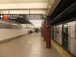This station has two tracks and two side platforms[43] and is approximately 535 feet (163 m) long.[21] The J train stops here at all times, while the Z train stops here during rush hours in the peak direction.[44] The Broad Street station is the southern terminus of both routes; the next station to the north is Fulton Street.[45] In contrast to the Fulton Street station, which is built on two levels because of the narrowness of Nassau Street, the Broad Street station is wide enough to accommodate both tracks on the same level.[20][21] South of this station, there are two center stub tracks ending at bumper blocks used for laying-up and relaying trains.[20][43] Trains terminate on the southbound track and continue to the center stub tracks, where they reverse direction. There is also a single switch north of the station to enable trains on the southbound track to return to the northbound track.[43]