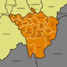 The London Borough of Bromley (/ˈbrɒmli/ ⓘ) is the largest and southeasternmost of the London boroughs that make up Greater London, bordering the ceremonial county of Kent, which most of Bromley was part of before 1965. The borough's population is an estimated 332,336. It is named after Bromley, its principal town; other major towns are Penge, Hayes, West Wickham, Chislehurst, Beckenham and Orpington. The local authority is Bromley London Borough Council.[n 1]