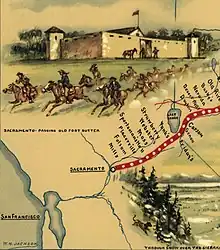 At the age of 11 Miller claimed to have ridden part of the route of the Pony Express carrying its mail, becoming the youngest rider to do so.[4][5] Miller claimed that in July 1861 he was outside the Pony Express station in Sacramento when a horse arrived without its rider. He was told that the rider was likely killed in a Native American attack and Miller begged for the opportunity to replace him, explaining that he was familiar with the route to the next station, Placerville. Miller stated that this request was granted and that after successfully delivering the mail he was appointed by the Express to carry the mail between Carson City and Placerville until the service ended in October.[6][5] Miller claimed that during his service he survived two arrow wounds.[5]