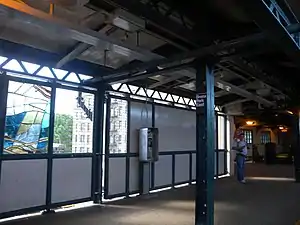 This elevated station has three tracks and two side platforms.[9] Old signs at the center exit stairs and have been painted over, but those on the southbound platform are still visible through the paint. Covered windows in the concrete wall are also present.