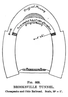 The Brookville Tunnel was constructed in an elliptical form,[40] a design typical of tunnel construction during the 1800s[41] and also used on the Blue Ridge and Greenwood Tunnels.[37] In a November 1849 report, Crozet describes the design to be used on the tunnels: