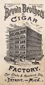 Brown Brothers Tobacco Company was located at 119 State Street in Detroit. The building was built for brothers, Robert Hamilton Brown and John Brown who founded a cigar manufacturing business which was, at one time, the largest cigar factory under one roof in the world. Brown Brothers were known for the following cigar brands: Newsboys, Cremo, Fontella, Carmencita, Evangeline and Detroit Free Press.[1][2][3][4][5]