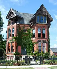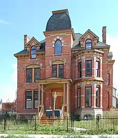 1885 | 104 Edmund Pl. | French Renaissance Revival, Gothic Revival | Originally owned by lumber baron Lucien S. Moore, 104 Edmund Place, built around 1885[18] in a French Renaissance Gothic Revival style and restored in 2006, has 7,000 sq ft (650 m2).[9][67] The Lucien Moore House restoration was featured December 27, 2005, by HGTV's restore America Initiative in partnership with the National Trust for Historic Preservation.[68][69] It may also be known as the Moorie Town House or The Edmund. | |