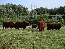Ruby Red Devon cattle used for conservation grazing; on Rushy Bay Green, Bryher.