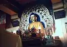 An important Buddhist shrine (located opposite to the Namgyal Monastery in the same courtyard) in the town is the Tsuglagkhang or Tsuglag Khang, known as the Dalai Lama's temple. It houses the statues, in sitting postures, of Shakyamuni (gilded)- the central image, Avalokiteśvara (the deity of compassion sculpted in silver with eleven faces and thousand arms and eyes -linked to a legend), and Padmasambhava (Guru Rinpoche) – both facing the direction of Tibet – and also the Tibetan Institute of Performing Arts. Dalai Lama's residence is opposite to this temple. A festival is held here every year, during April and May, when traditional dances and plays are enacted.[45][46][47]8 kilometres (5.0 mi) away from Dharamshala, at Sidhpur, a small monastery called the Gompa Dip Tse-Chok Ling, the Gangchen Kyishong (called Gangkyi in short by Tibetans and Library by Indians is the premises of the Tibetan government-in-exile), Mani Lakhang Stupa, Nechung Monastery, Norbulingka Institute, Sidhpur are located. The Karmapa (who was in Norbulinga in Tibet before taking refuge in India) is now living in Gyato monastery.