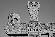 Carved decorations on the doorway of Sanchi stupa, note the dharma chakra, various animals, and Triratna (with srivasta in the center).