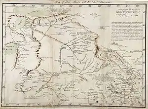 There had long been a hope that a river flowing west from the Rocky Mountains to the Pacific Ocean would provide an easy route for travel and trade. This dream was the descendant of the long sought Northwest Passage.[lower-alpha 5] When Francisco Garcés drew his maps of Alta California, he did not understand the nature of the Sierra Nevada, and he drew the "San Felipe" or San Joaquin River originating beyond the Sierras in the Great Basin and flowing to the Pacific Ocean, in or near San Francisco Bay. Then, when Manuel Augustin Mascaro and Miguel Constanso made the first map of the whole Viceroyalty of New Spain (1784), they extended the "San Felipe" almost to the Sevier Lake.[18] A similar map was published in 1820 by Sidney E. Morse showing the Rio de San Buenaventura flowing into a lake, the western limits of which are unknown.[19] This map shows the "Supposed river between the Buenaventura and the Bay of Francisco, which will probably be the communication between the Atlantic and the Pacific" toward this lake, but quite not connecting with it.[lower-alpha 6] A map by J. Finlayson (1822) shows a Rio de S. Buenaventura originating near the "Principle [sic] source of the Rio Colorado" and emptying into a salt lake the western limits of which "are unknown". This same map indicates that an uncharted Rio de San Filipe crosses a range of mountains at 122 degrees west longitude.