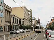 The remaining 20% of its track (1.2 miles (1.9 km)) are on the surface on Main Street in downtown Buffalo, which includes a brief underpass of Buffalo’s tallest building, the Seneca One Tower.[17] On the surface section, trains interact with automobile traffic from the theater district where it emerges from the tunnel until Mohawk Street where it reverts to a transit mall and at cross streets, where movements are governed by traffic signals. Catenary poles are spaced every 130 feet (40 m) to support the overhead electrical lines.[18] Metro Rail operates electric multiple-unit light rail vehicles (LRVs) in two-to-four car trains with power drawn from an overhead catenary system. Three-car trains are limited to rush hour and special events and four-car trains to special events.[17][19] The Buffalo trains join Philadelphia's SEPTA light rail cars as the only modern non-articulated LRVs operating in the United States.